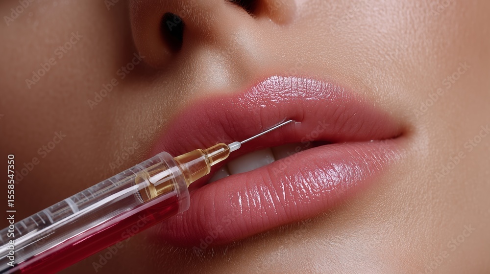 Cosmetic procedures. Close-up of lips filler with a syringe for cosmetic procedures. #1558547350
