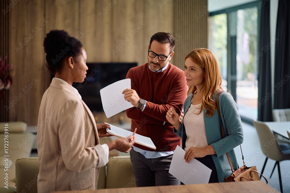 Couple going through paperwork with their real estate agent during open house day. #1722763916