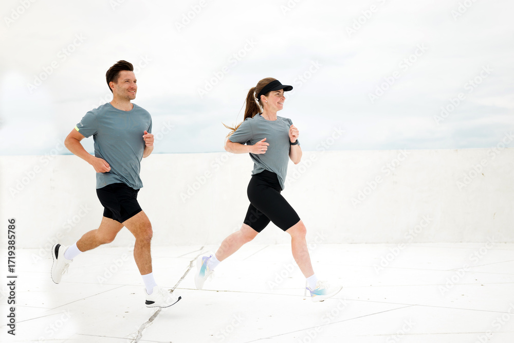 Couple jogging on outdoor track giving a sense of teamwork and fitness #1719385786