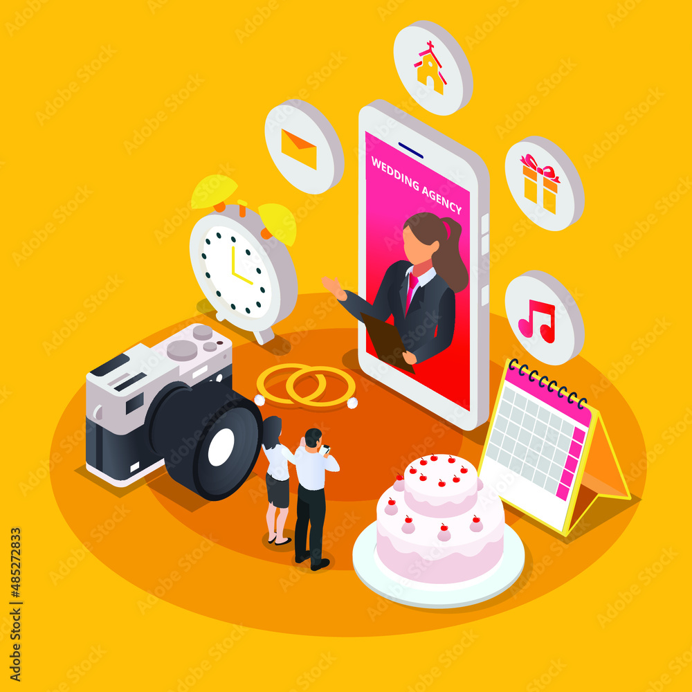 Couple making video call to their wedding consultant online isometric 3d vector illustration concept banner, website, landing page, ads, flyer template #485272833