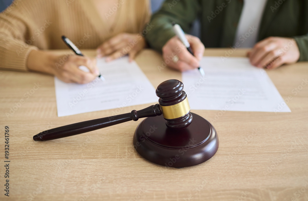 Couple signing divorce document at court with gavel. Focus on legal paperwork and signature for separation agreement, showing mediation, law and asset split. Strong concept of legal conflict. #1932461769