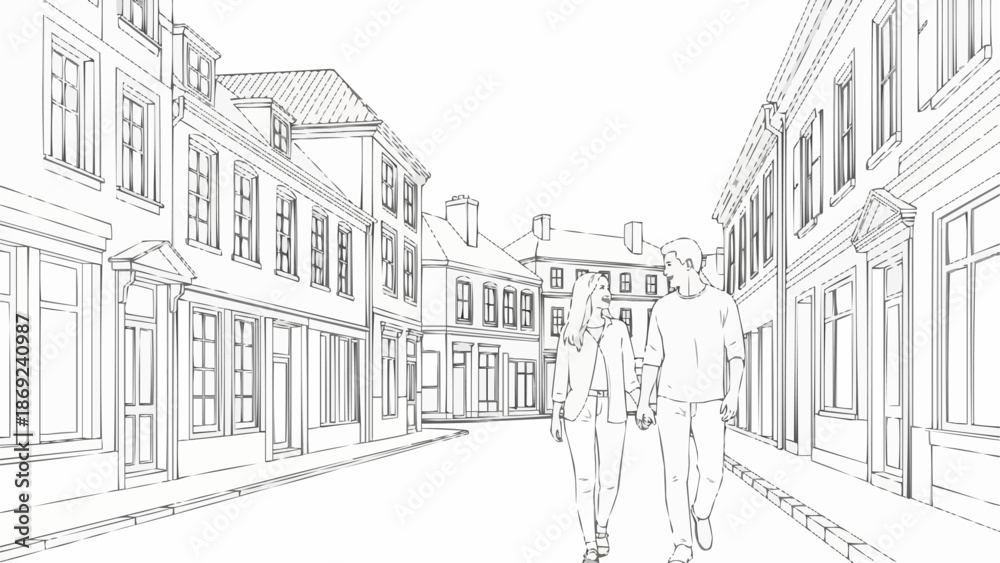 Couple walking hand in hand down a charming European street. #1869240987