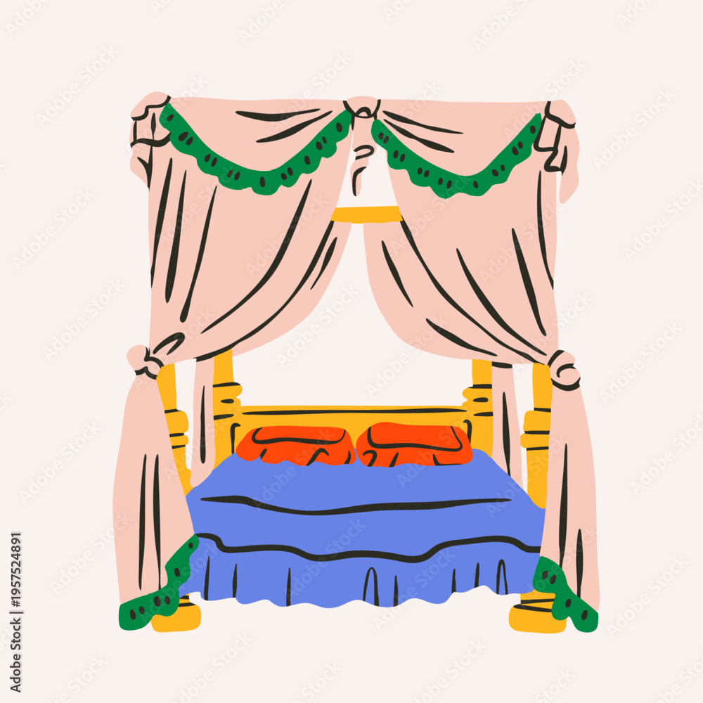 Cozy big, double, king, queen, full sized Canopy bed. Colorful cotton silk linen, pillows, bed curtains. Different colors. Hand drawn trendy Vector illustration. Isolated design element #1957524891