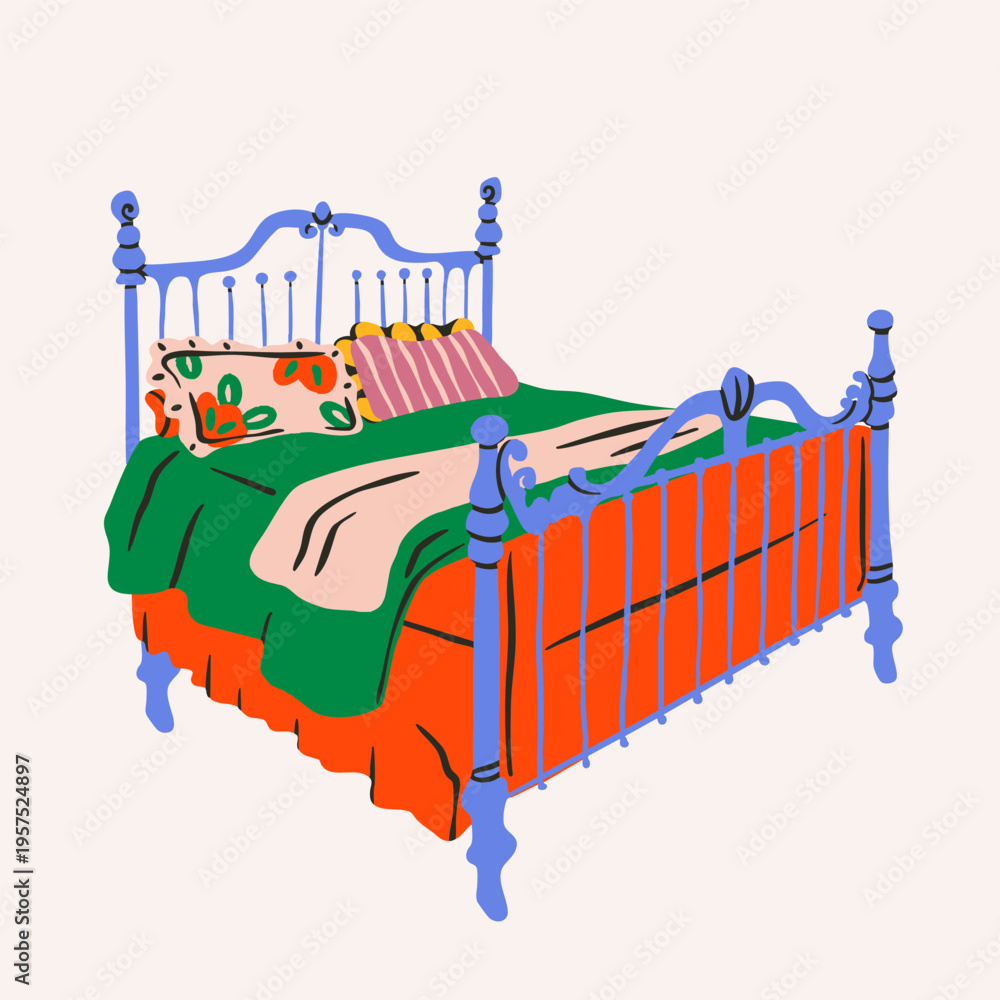 Cozy big, double, king, queen, full sized sleeping Bed. Colorful cotton silk linen, pillows. Iron frame. Bright colors. Hand drawn trendy Vector illustration. Isolated design element #1957524897