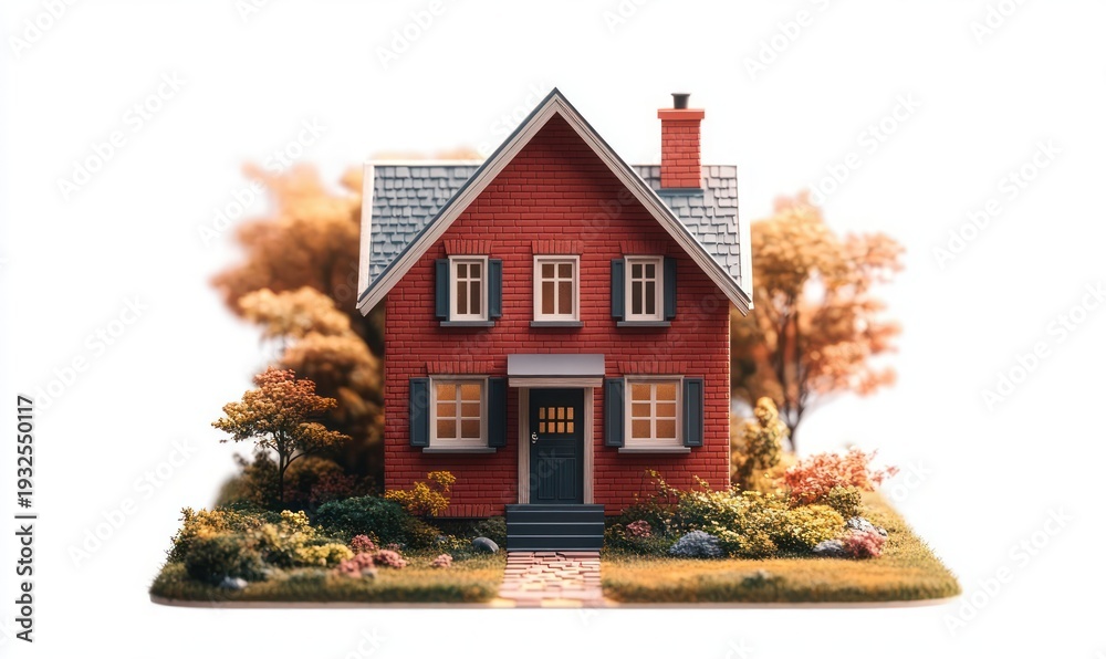cozy red two-story house with gray gabled roof and chimney, shuttered windows, dark front door, stone path, lush autumn garden and warm inviting atmosphere #1932550117