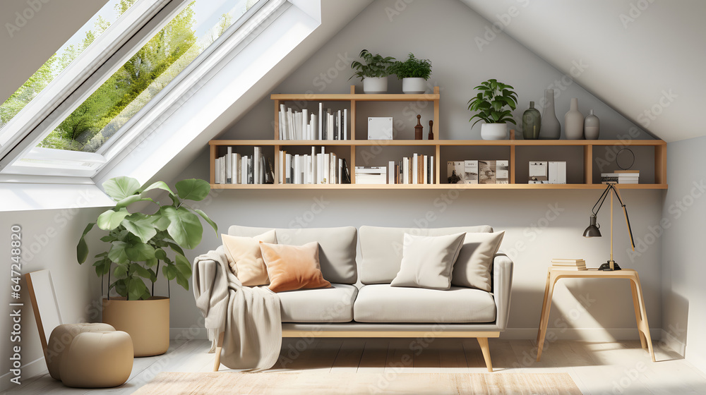 Cozy sofa against skylight window near grey wall with wooden shelf. Scandinavian interior design of modern stylish living room in attic #647248820