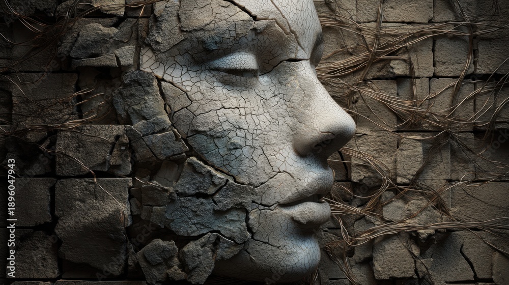 Cracked stone face of a woman emerging from a textured brick wall with creeping vines. Ancient art and forgotten civilization concept. #1896047943