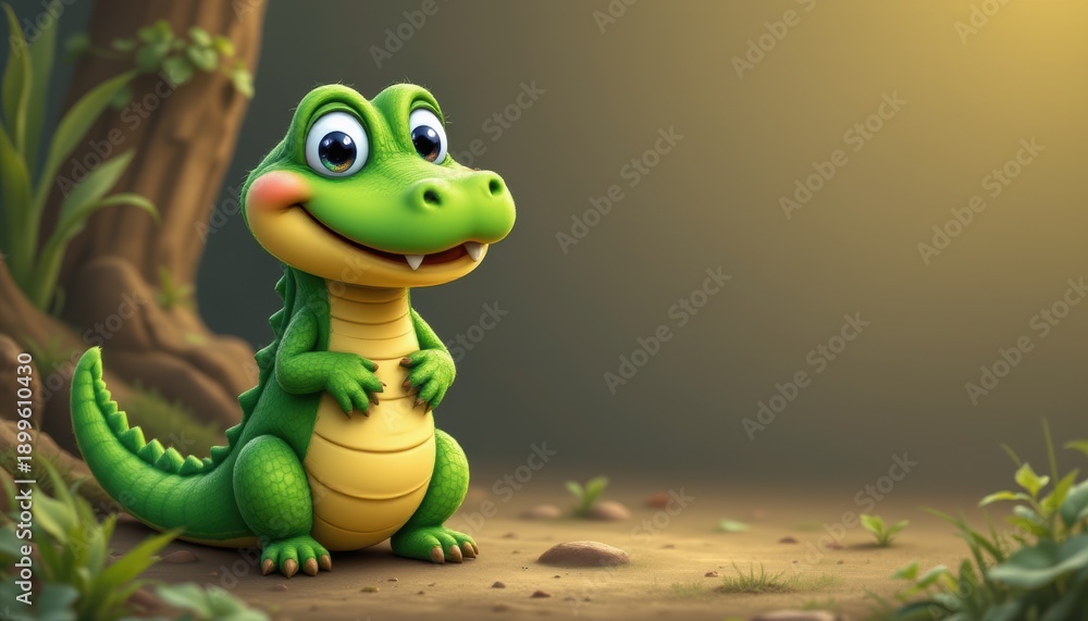 create a charming and cute cartoon alligator character as the main subject of your image, positioned on the left side of the frame with ample copy space to its right for optimal photo usage #1899610430