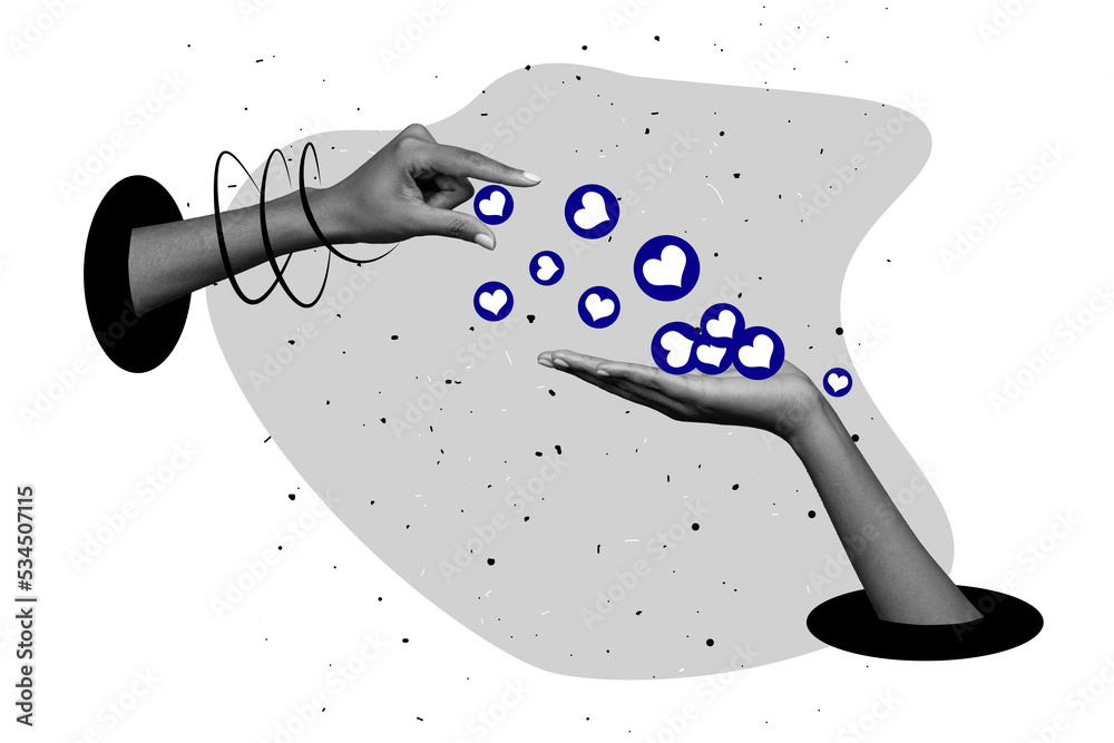 Creative abstract template collage of hands marketer smm manager customer pouring likes hearts icon social media reaction blogger algorithm #534507115