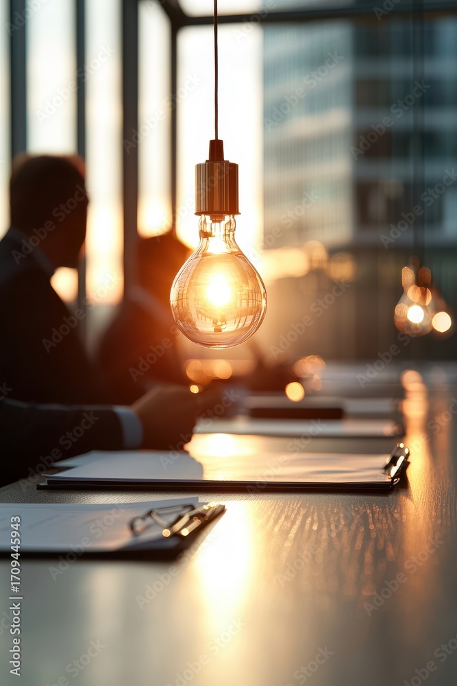 Creative concept glowing light bulb with sunlight shining through, symbol ideas, innovation and business inspiration. Blurred office meeting background conveys teamwork, leadership, corporate vision #1709445943