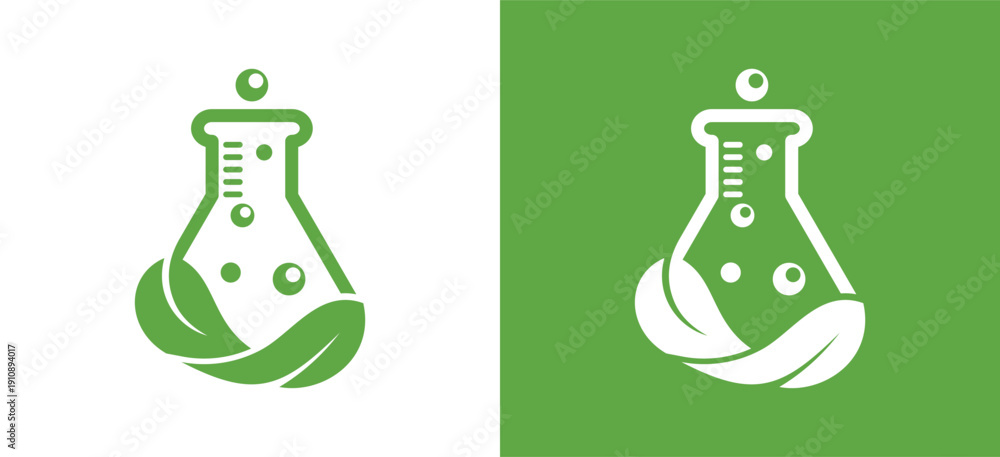 Creative eco logo combining laboratory flask and leaf symbol. Ideal for natural ingredient, organic product and green science branding. #1910894017