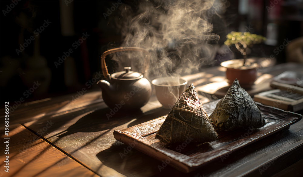 Creative food template. Steaming hot Zongzi, Bak Zhang, glutinous sticky rice dumplings with oriental clay teapot on traditional Chinese teahouse wooden table with bonsai plant. copy text space #1968056592
