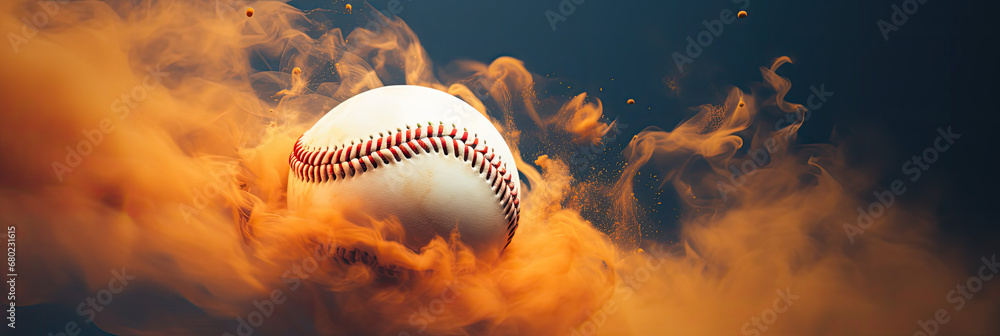 creative panorama banner with baseball in orange cloud of smoke #680231615