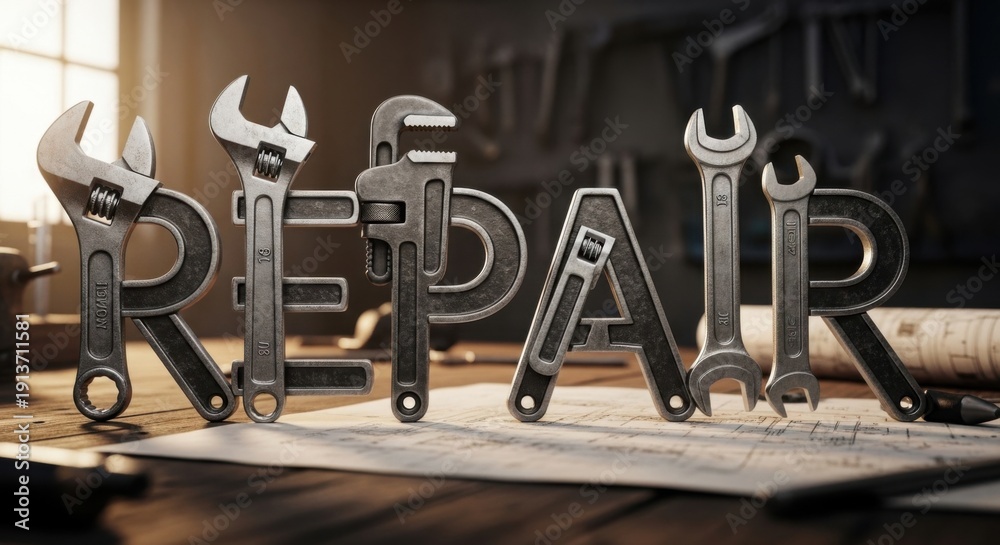 Creative Repair Word Art with Tools on a Wooden Surface. #1913711581