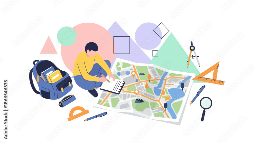 Creative Urban Planner Making Notes on a Map with School Supplies around #1866546335