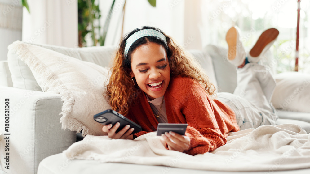 Credit card, phone and excited with woman on couch for online shopping, ecommerce and sale. Digital payment, banking website and person in living room of home for deal, transaction or subscription #1808531308