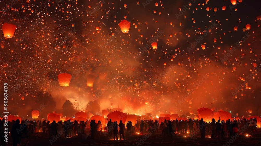 Crowd releases glowing lanterns into the night sky at a festive celebration, filling the air with vibrant orange lights and smoke. #1905674178