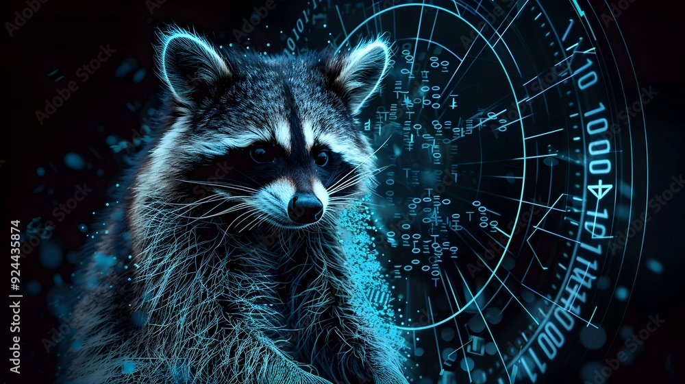 Curious Raccoon Enveloped in a Holographic Digital World of Binary Codes and Tech #924435874