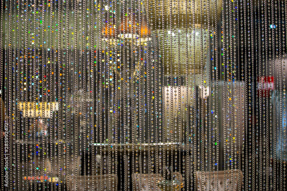 Curtain of glass drops. Crystal beads blind curtain background, concept of Luxury . backdrop for wedding celebration Invitation #285992472