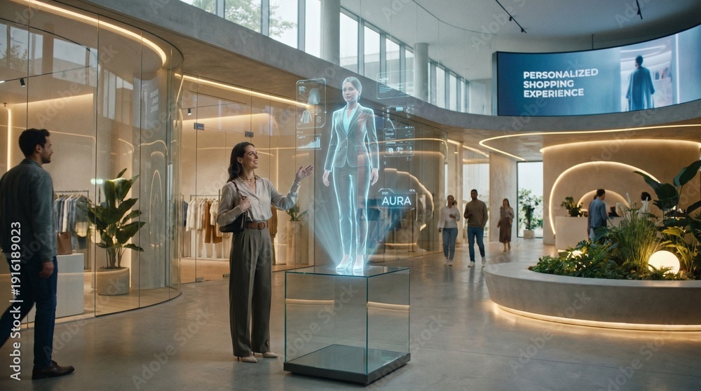 Customer interacting with a personalized AI hologram assistant in a luxury futuristic shopping mall #1916189023