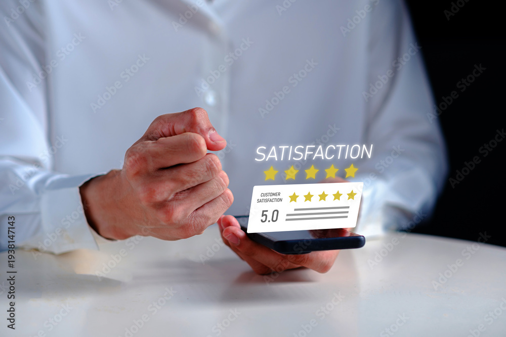 Customer satisfaction concept showing five star rating and positive feedback on smartphone screen. Business user celebrating excellent review score. Online service evaluation, customer experience #1938147143