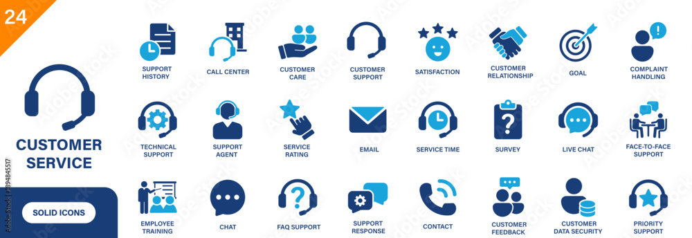 Customer service icon. Containing support agent, service rating, call center, satisfaction, customer feedback, support response. Solid vector icon set. #1894845517