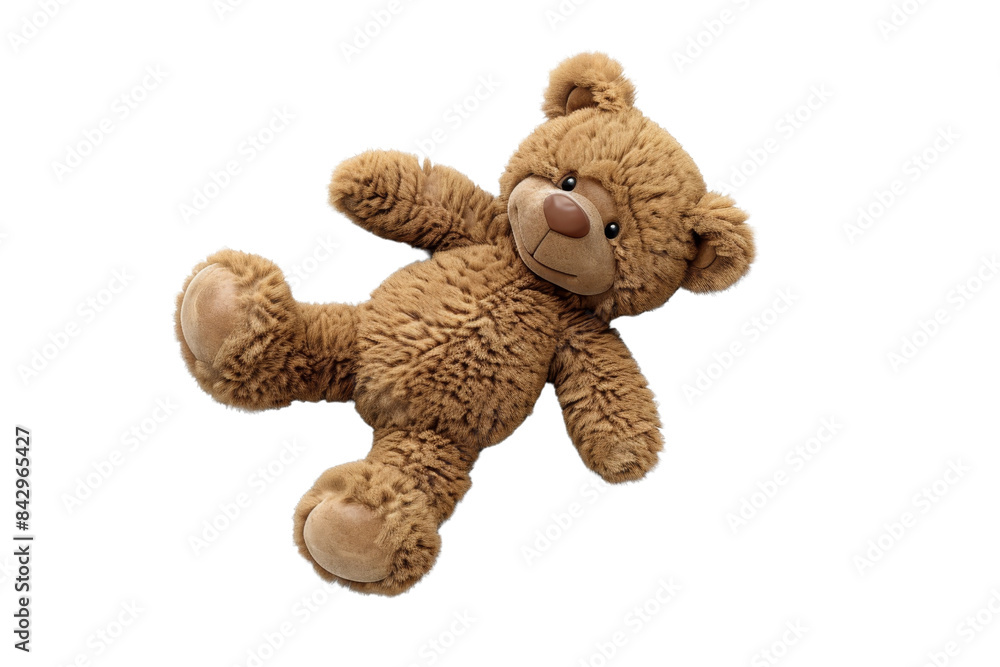 Cute and cuddly brown teddy bear lying on a transparent background. Perfect for children's toys and gift illustrations. #842965427