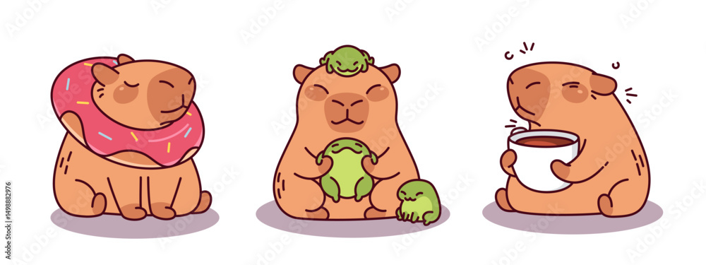 Cute capybara cartoon character set - chubby rodent with donut inflatable ring, adorable animal holding tiny frog friends, sleepy creature enjoying morning coffee. Kawaii funny mascot stickers. #1498882976