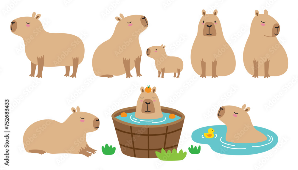 Cute capybara in various poses vector illustration set. Capybara in onsen water. Mom and baby capybara. #752683433