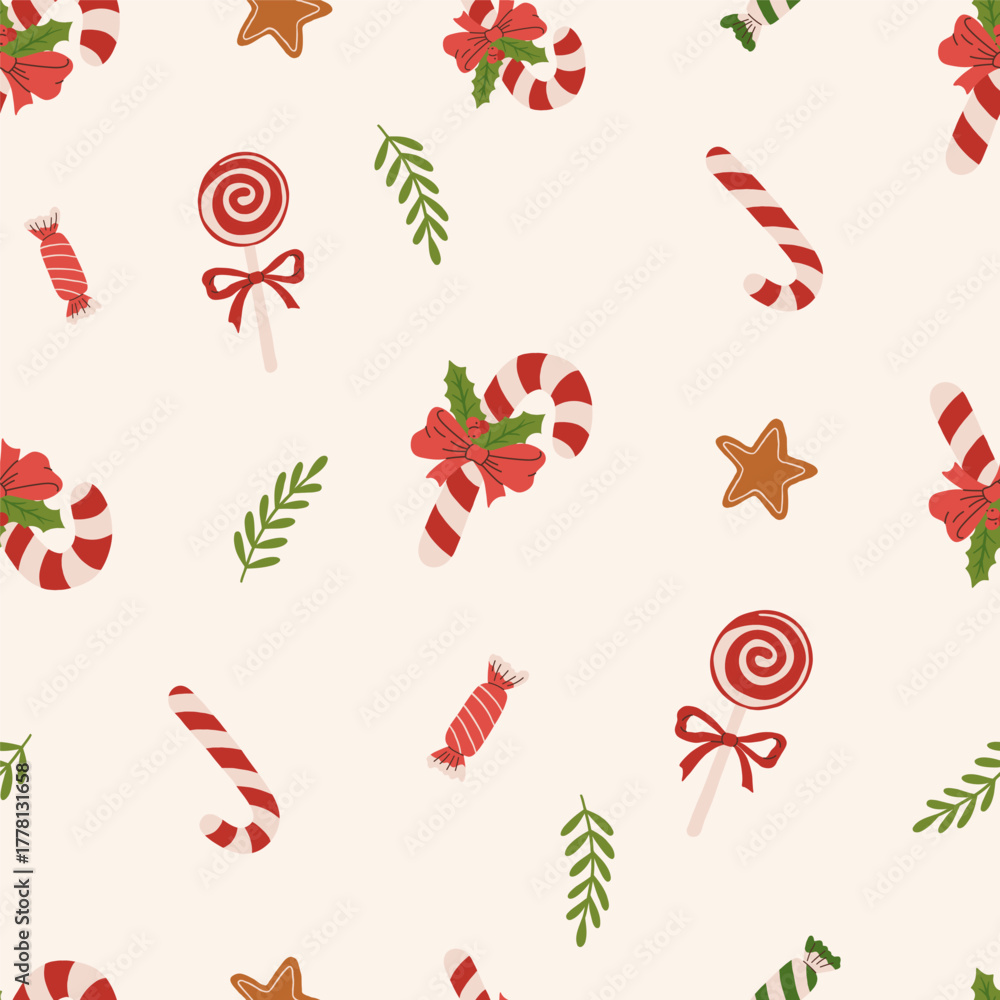 Cute Christmas holiday candy cane and sweets seamless pattern. Festive background. Vector illustration #1778131658