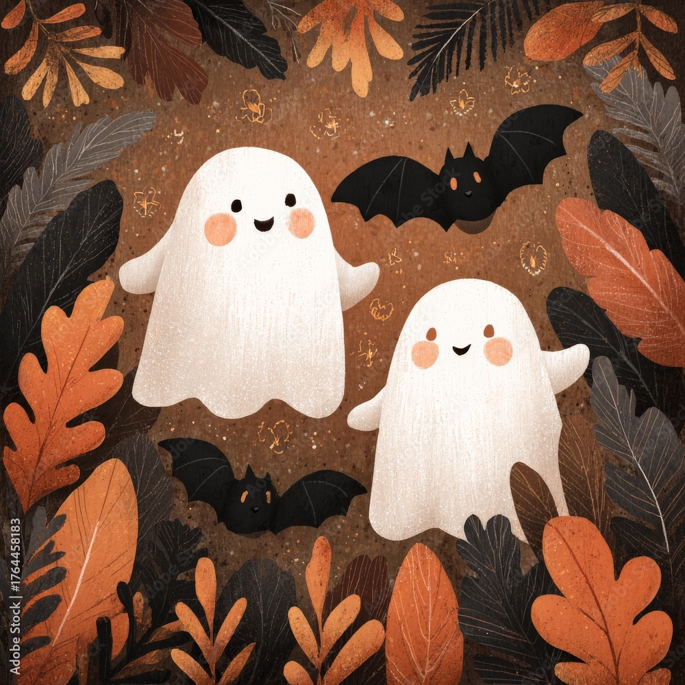 Cute ghosts and bats surrounded by autumn leaves during Halloween celebration #1764458183