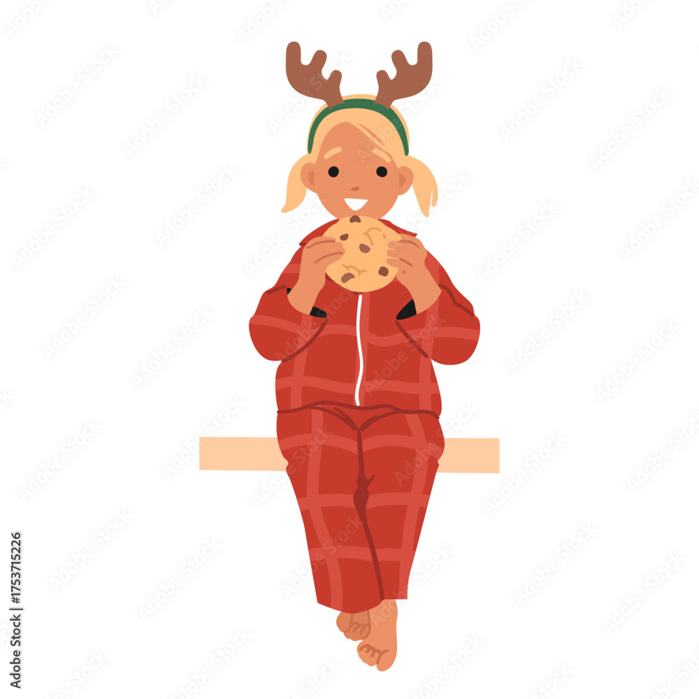 Cute girl child wearing festive pajamas and reindeer headband eating Christmas cookies on bench #1753715226
