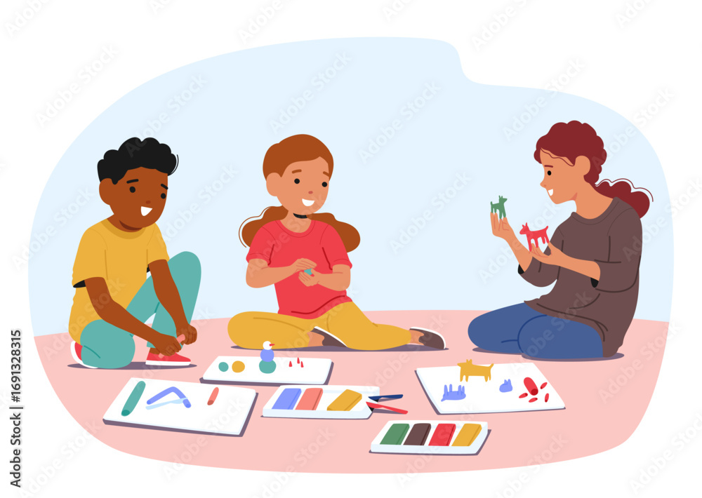 Cute girls children cartoon characters playing with clay plasticine modeling sculpture of animals #1691328315