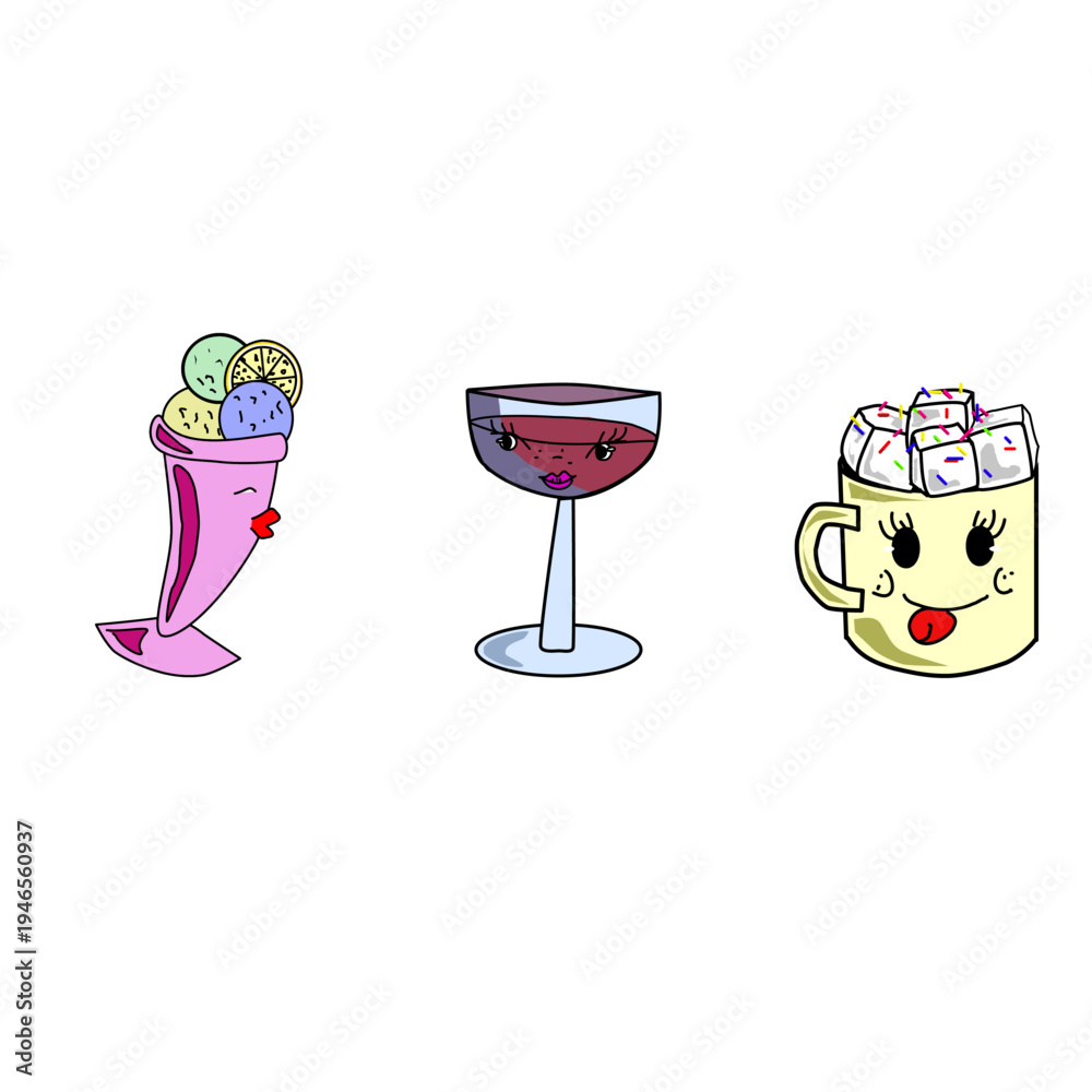 Cute Kawaii Character Set with Ice Cream, Cocktail Glass, and Hot Chocolate Mug #1946560937