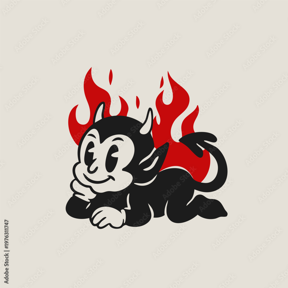 Cute little horned Devil. Funny black character with fire, flame. Hand drawn Vector illustration. Halloween, vintage style. Retro cartoon mascot. Isolated design element. Sticker, logo, print template #1976311747