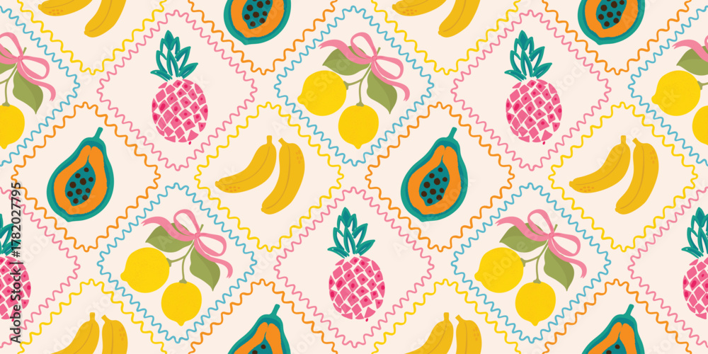Cute tropical fruit pattern with pineapples, bananas and pink background in a diamond grid layout. Perfect for kids wallpaper and clothing prints #1782027795