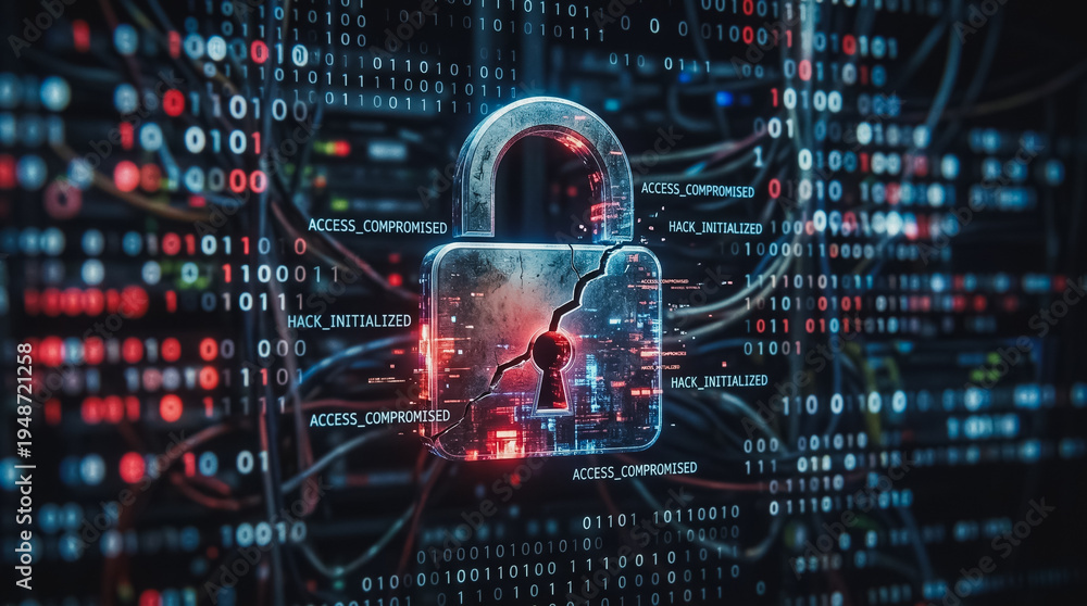 Cybersecurity Data Breach Concept Featuring a Broken Digital Padlock over Binary Code and Network Server Wires #1948721258