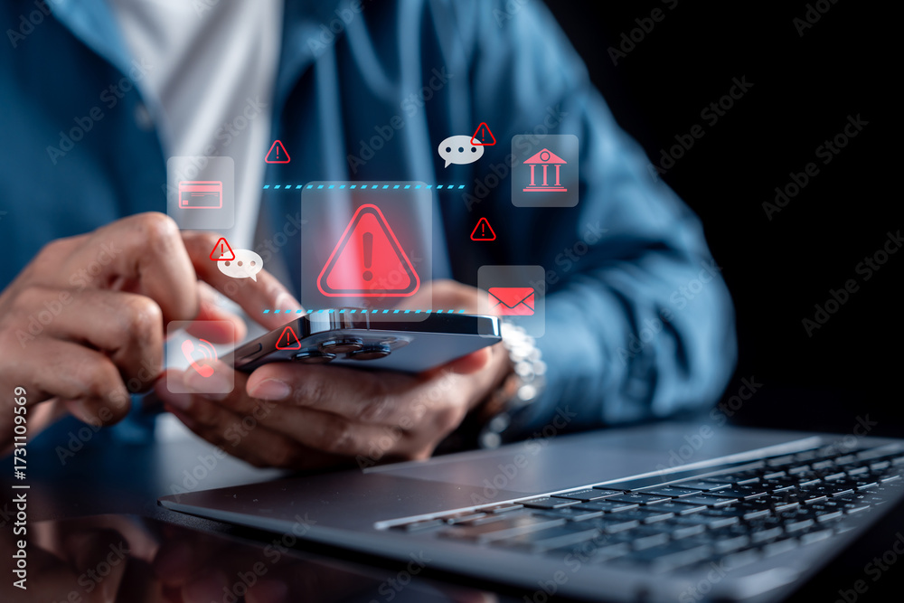 Cybersecurity warning concept with businessman using smartphone and red alert icons, online fraud, phishing scam, data protection, internet security, and digital risk management. #1731109569