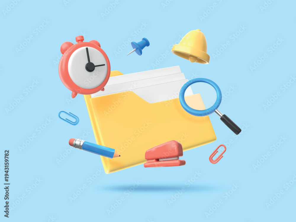 3D document icons. Administration and accounting. Render folder or office service for paper doc. Database file elements. Management audit magnifier. Stationery and bell. Vector concept #1943159782