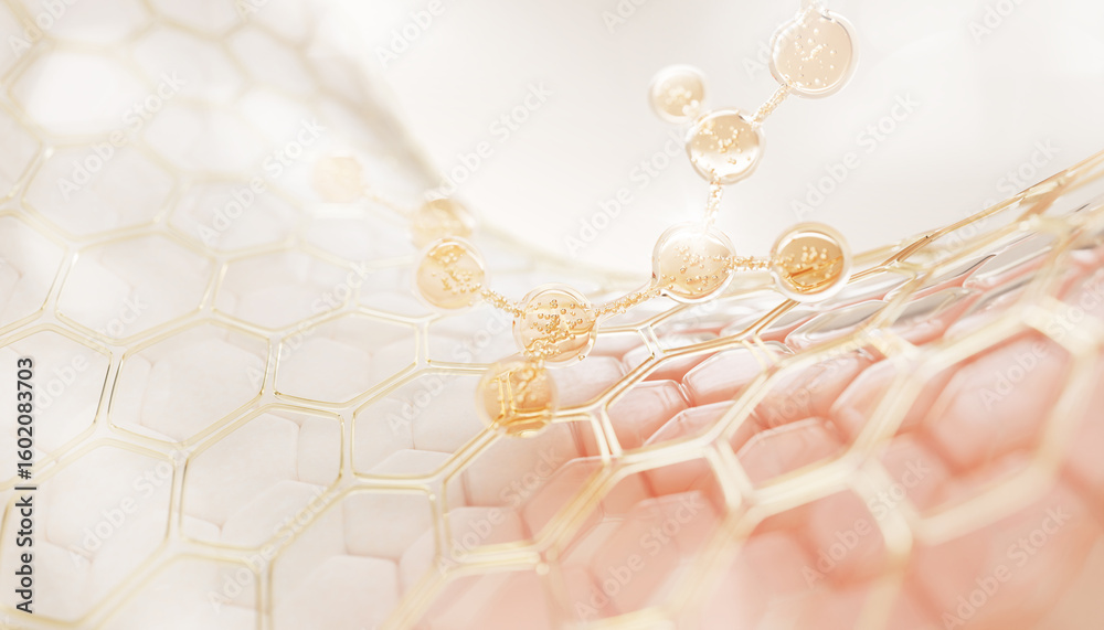 3d epidermis skin layer with hexagon cell pattern and molecule. Gold liquid honeycomb texture with cosmetic oil drop, collagen serum, retinol vitamin, hyaluron essence for moisture. 3D illustration #1602083703