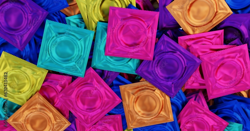 3d illustration bright condoms fill the entire screen. Pattern screensaver, background, contraceptives, safety concept, healthy lifestyle #670413482