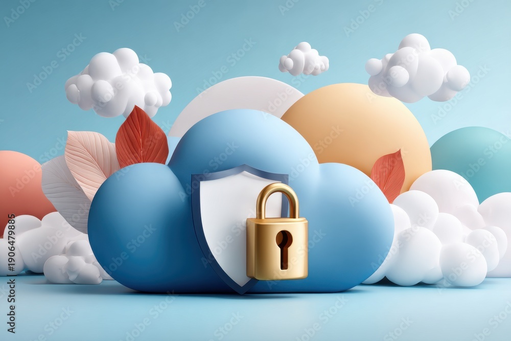 3D illustration of a cloud security icon with shield on colorful layered clouds #1906479885