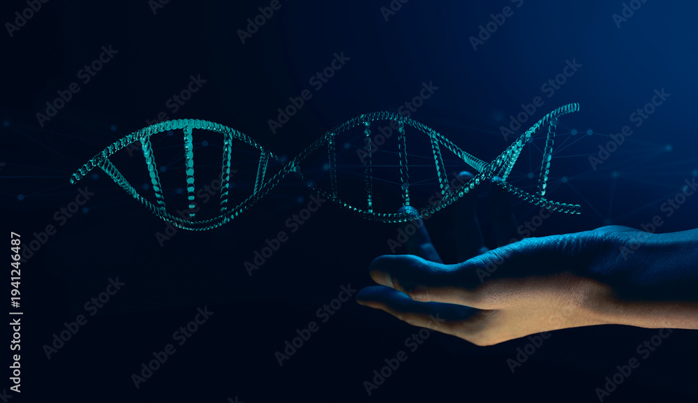 3d of human hand holding the light blood dna cell double helix structure, network of healthcare business #1941246487