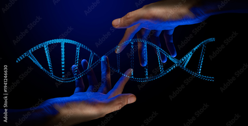 3d of human hand holding the light blood dna cell double helix structure, network of healthcare business #1941246630