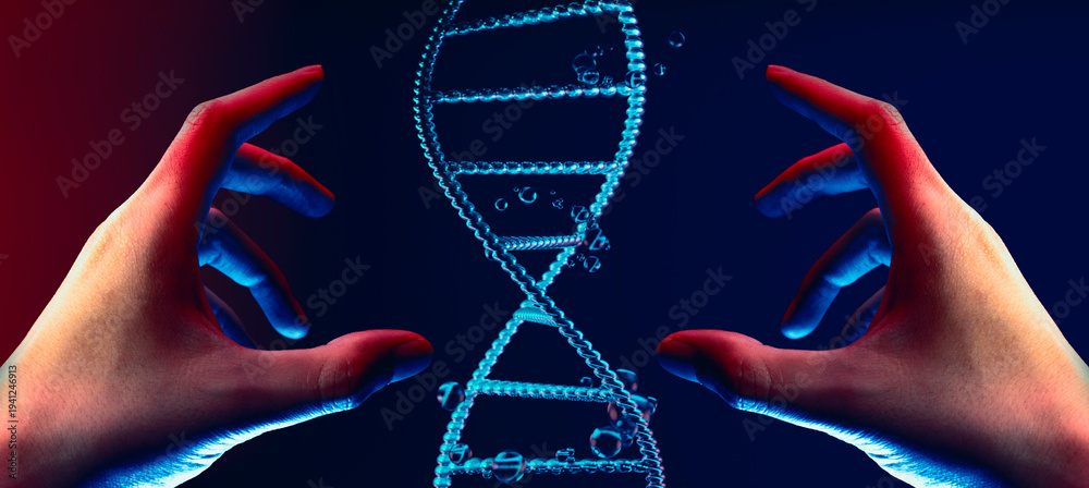 3d of human hand holding the light blood dna cell double helix structure, network of healthcare business #1941246913