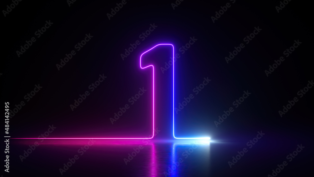 3d render, neon number one glowing in the dark with ultraviolet light, pink blue gradient laser ray #484142495