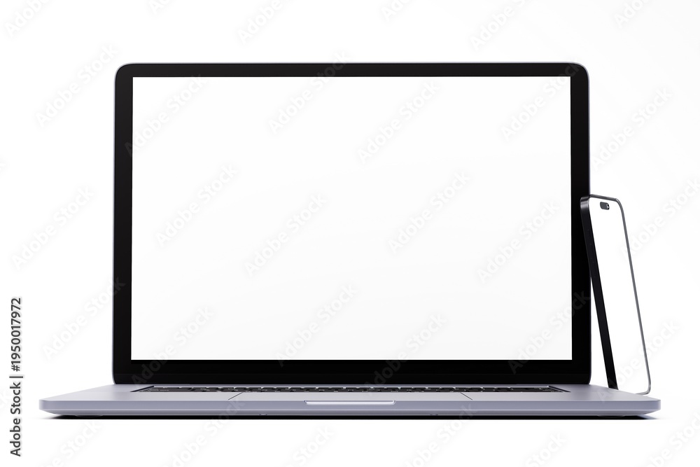 3D render of laptop and smartphone mockups on clean white studio background. #1950017972