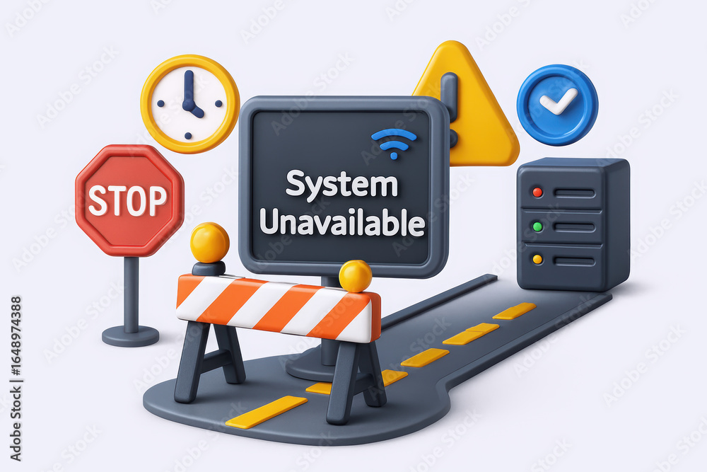 3D rendering of a system unavailable sign with icons, a stop sign, and a roadblock, conveying a warning message. #1648974388