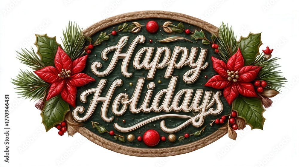 3d Round logo for a t-shirt design with the words "Happy Holidays" featuring an illustration of classic Christmas elements like holly, christmas trees, ornaments. banner sign, solid white #1770946431