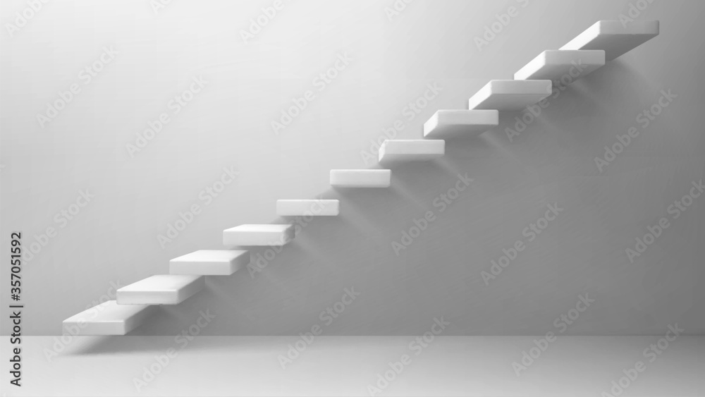 3d stairs, white staircase on blank wall background. Way to business success, career ladder, architecture construction for building interior or exterior decoration. Realistic vector illustration #357051592